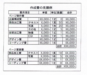 【作成費】 外注の場合、ホームページ作成費は業者によってかなり開きがあります。業者といっても、プロバイダーで請け負ってくれるところ、専門に作成している会社、フリーランスでページづくりを請け負う個人、といろいろあります。プロのつくったホームページはレベルの高いものですが、そのレベ ルは業者によりまちまちです。また、自分たちのイメージに合う、合わないなどの問題もあるので、できればその業者のホームページ(当然ながらその業者が作成したもの)を見てみることをおすすめします。さらに、こちらで立てた企画案をもとに、直接相談しながら作成案をつくり、プレゼンテーションまでしてもらえるような業者なら安心です。業者とのコミュニケーションを密にして作成を進めることが重要です。