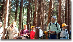 「古事の森」は国定公園内の筑波山中腹の複層林試験地の一部にあたる。立松和平氏の提唱で始まった、伝統的建造物の修復材となる巨木を育てる森林づくりで、京都に次いで2番目に選ばれた場所である。今日の作業には、森林管理署の方と八郷町森林組合の方が作業の指導にあたって下さる。