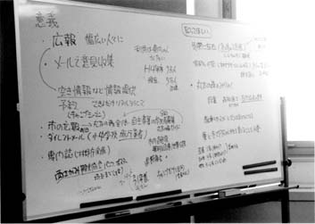| コンセプトなどは、ボードに書き出しながら会議を進めます。わかりやすく、新しい意見もだしやすいものです。ブレーンストーミングでは、思いついたことをフリートークでどんどんあげてもらいますが、出し切るまでは他の人の意見を批判しないことが原則です。 |